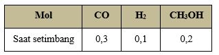Dalam ruangan yang bervolume 3 L direaksikan gas karbon monoksida dan hidrogen membentuk etanol, dengan reaksi kesetimbangan sebagai berikut.
