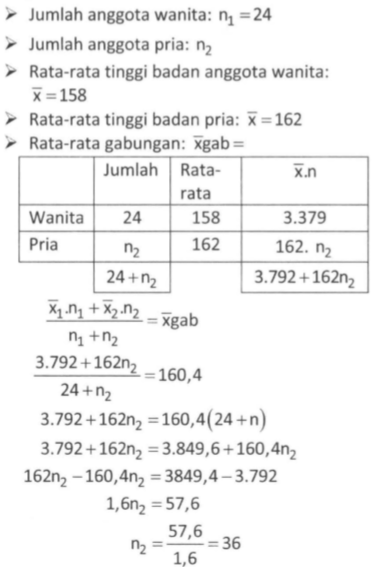 Dalam suatu organisasi kepemudaan terdapat 24 orang anggota wanita. Rata-rata tinggi badan anggota wanita adalah 158 cm dan rata-rata tinggi badan anggota pria adalah 162 cm. Jika rata-rata tinggi badan anggota organisasi tersebut 160,4 cm, maka jumlah anggota pria adalah ...