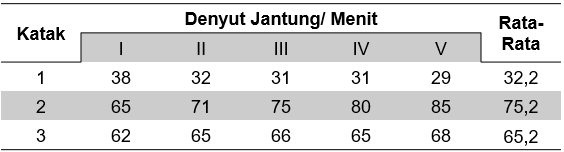 Dalam suatu percobaan dilakukan 3 perlakuan berbeda untuk menghitung perbedaan frekuensi denyut jantung katak. Ketiga katak akan bius kemudian dibedah untuk dipisahkan jantung dengan organ lain dan masing-masing katak dihitung banyaknya denyut jantung dalam lima menit dengan pencatatan denyut setiap 1 menit. Katak pertama setelah pembedahan akan langsung dihitung, katak kedua setelah dibedah akan ditetesi larutan hipertonis berupa ringer laktat (cairan infus berupa elektrolit) pada permukaan jantungnya dan dihitung, katak ketiga setelah dibedah akan ditetesi larutan hipotonis berupa NaCl 0,6% pada permukaan jantungnya dan dihitung. Hasil percobaan diperoleh jumlah denyut pada menit pertama sampai dengan kelima yang disajikan dalam tabel berikut: