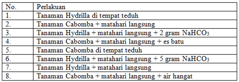 Daniel melakukan percobaan Ingenhousz dalam proses fotosintesis. Pada percobaan ini digunakan beberapa perangkat seperti air panas, es batu, NaHCO₃, tanaman Hydrilla dan tanaman Cabomba. Morfologi daun tanaman Cabomba, yaitu memiliki jumlah daun yang lebih sedikit dibandingkan dengan daun Hydrilla. Sari melakukan percobaan di tempat teduh dan di bawah sinar matahari yang terik.