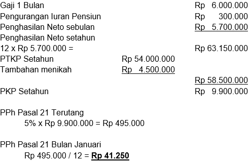 Danu pada tahun 2019 bekerja pada perusahaan PT Kecap dengan memperoleh gaji sebulan Rp6.000.000,00 dan membayar iuran pensiun sebesar Rp300.000,00. Danu menikah tetapi belum mempunyai anak. Pada bulan Januari penghasilan Danu dari PT Kecap hanya dari gaji. Hitunglah PPH 21 bulan Januari!