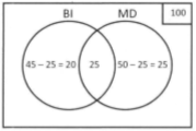 Dari 100 mahasiswa, terdapat 45 orang mengikuti kuliah Bahasa Indonesia, 50 orang mengikuti kuliah Matematika Dasar dan 25 orang mengikuti kedua mata kuliah itu. Dipanggil seorang di antara 100 mahasiswa, peluang mahasiswa yang dipanggil itu tidak mengikuti kedua mata kuliah tersebut adalah ...