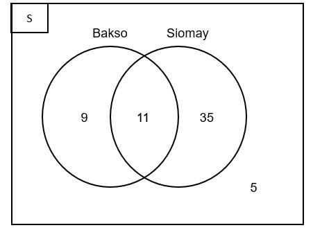 Dari 60 mahasiswa terdapat 20 orang suka bakso, 46 orang suka siomay dan 5 orang tidak suka keduanya. Buatlah diagram Vennya!