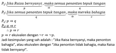 Jika Raisa bernyanyi maka semua penonton tepuk tangan. Jika semua penonton tepuk tangan maka mereka bahagia. Kesimpulan yang sah adalah ....