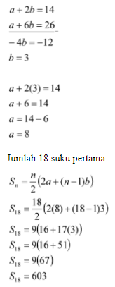 Dari barisan aritmetika diketahui suku ke-3 adalah 14 dan suku ke-7 adalah 26. Jumlah 18 suku pertama adalah....