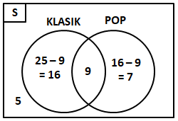 Dari sekelompok anak diketahui 25 anak gemar musik klasik, 16 anak gemar musik POP dan 9 anak gemar keduanya. Jika 5 anak tidak gemar keduanya, maka jumlah anak dalam kelompok tersebut adalah.…
