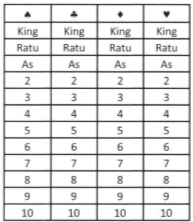 Dari seperangkat kartu bridge diambil secara acak satu lembar kartu. Peluang yang terambil bukan kartu As adalah ...