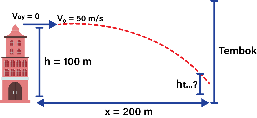 Dari suatu bangunan setinggi 100 m dari atas tanah ditembakkan horizontal sebuah peluru dengan kecepatan awal 50 m/s. Suatu tembok yang cukup tinggi terletak di seberang bangunan tersebut yang jaraknya 200 m. Pada ketinggian berapa peluru akan mengenai tembok dan berapa kecepatannya?