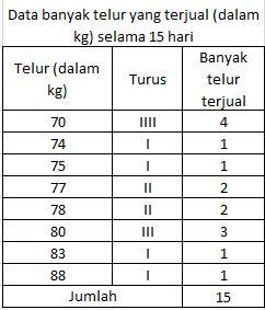 Data banyak telur yang terjual (dalam kg) selama 15 hari di sebuah agen adalah sebagai berikut :