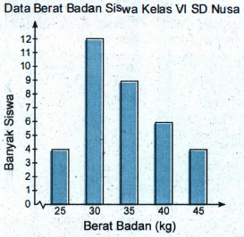 Data berat badan (dalam kg) siswa kefas VI SD Nusa disajikan pada diagram batang berikut.