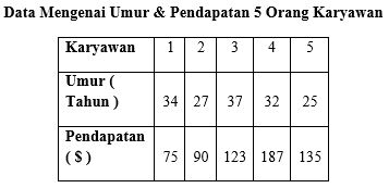 Data berikut menunjukan umur dan pendapatan 5 orang karyawan di sebuah perusahaan X :