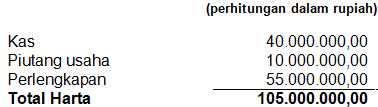 Data keuangan persewaan tenda dan sound system antara lain kas Rp40.000.000,00, piutang Rp10.000.000,00, perlengkapan Rp55.000.000,00, dan utang usaha Rp30.000.000,00. Dari data tersebut, modal usaha persewaan tersebut sebesar ....