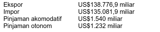 Data negara CC menunjukkan total ekspor sampai September 2018 sebesar US$138.776,9 miliar dan total impor sebesar US$135.081,9 miliar. Negara CC memiliki pinjaman akomodatif sebesar US$1.540 miliar dan pinjaman otonom sebesar US$1.232 miliar. Neraca pembayaran negara tersebut akan mengalami ….