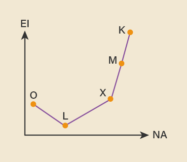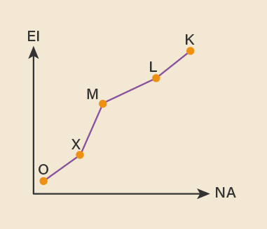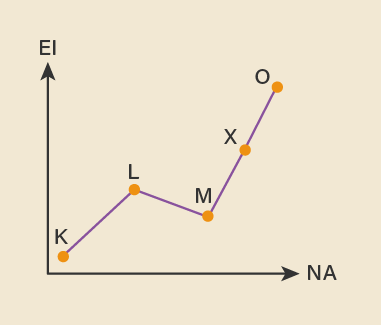 Grafik yang menunjukkan kecenderungan energi ionisasi dari unsur-unsur K, L, M, X, O tersebut adalah ....