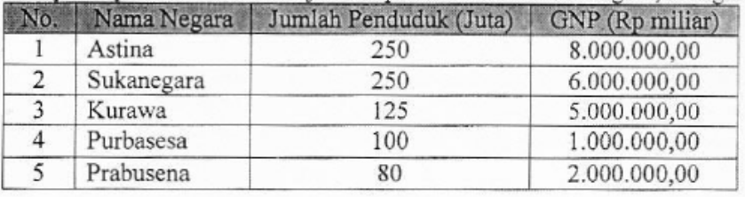 Data pendapatan nasional dan jumlah penduduk dari lima negara, sebagai berikut :