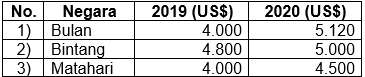 Data pendapatan per kapita tiga negara pada 2019 dan 2020 sebagai berikut.