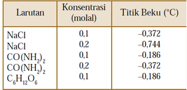 Berdasarkan data tersebut dapat disimpulkan bahwa penurunan titik beku bergantung pada….