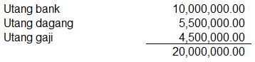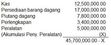 Data sebagian neraca PD Pusaka per 31 Desember 2020 antara lain kas Rp12.500.000,00, persediaan barang dagang Rp17.000.000,00, piutang dagang Rp7.800.000,00, perlengkapan Rp3.400.000,00, peralatan Rp5.000.000,00, utang bank Rp 10.000.000,00, utang dagang Rp5.500.000,00, dan modal Rp 15.000.000,00.