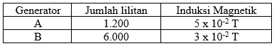 Jika kedua generator berputar dengan frekuensi yang sama maka perbandingan ggl induksi yangdihasilkan generator B terhadap generator A adalah ….