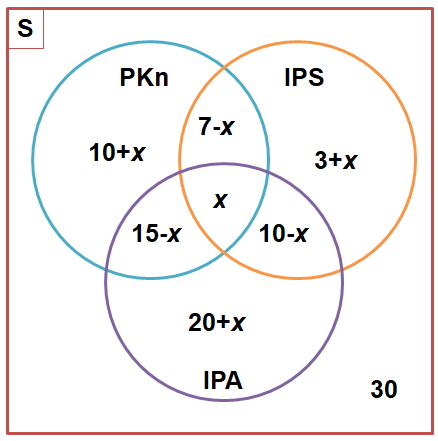 Di antara 100 siswa, 32 orang suka PKn, 20 orang suka IPS, 45 orang suka IPA, 15 orang suka PKn dan IPA, 7 orang suka PKn dan IPS, 10 orang suka IPS dan IPA, 30 orang tidak suka satu pun di antara ketiga mata pelajaran tersebut. Berapakah banyaknya siswa yang suka ketiga mata pelajaran tersebut?