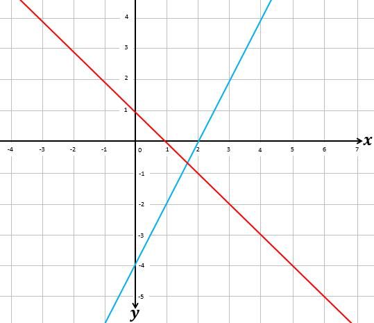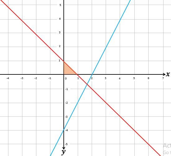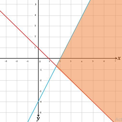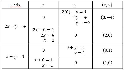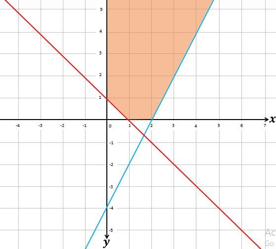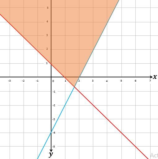Di antara pilihan jawaban berikut ini, yang menggambarkan daerah penyelesaian dari 2x - y ≤ 4, x + y ≥ 1, x ≥ 0, y ≥ 0 adalah .... (daerah berwarna oranye menunjukkan daerah penyelesaian).