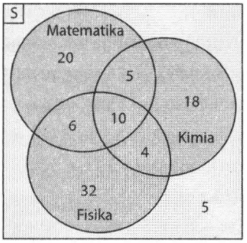 Di antara sekelompok siswa 100 orang, ternyata 41 orang suka Matematika, 52 orang suka Fisika, 37 orang suka Kimia, 16 orang suka Matematika dan Fisika, 15 orang suka Matematika dan Kimia, 14 orang suka Fisika dan Kimia, dan 5 orang tidak suka ketiga pelajaran tersebut. Maka berapa siswa yang suka ketiganya?