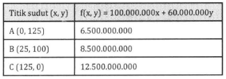 Di atas tanah seluas 1 hektar akan dibangun dua tipe rumah, yaitu tipe A dan tipe B. Tiap unit rumah tipe A luasnya 100 , sedangkan tipe B luasnya 75 . Jumlah rumah yang akan dibangun paling banyak 125 unit. Harga jual rumah tipe A adalah Rp100.000.000 dan tipe B adalah Rp60.000.000. Supaya pendapatan dari hasil penjualan seluruh rumah maksimum maka harus dibangun rumah sebanyak ....