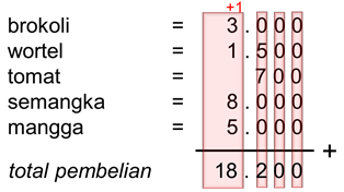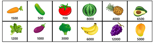 Ibu membeli sayuran berupa brokoli, wortel, tomat dan juga buah berupa semangka dan mangga. Jumlah uang yang harus dibayarkan Ibu adalah....