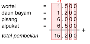 Kakak membeli sayuran berupa wortel, daun bayam dan juga buah berupa pisang dan alpukat. Jumlah uang yang harus dibayarkan Kakak adalah ....