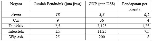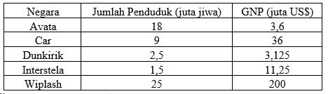 Di bawah ini adalah tabel jumlah penduduk dan GNP di beberapa negara
