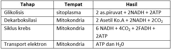 Di bawah ini adalah tabel tempat terjadinya proses respirasi.