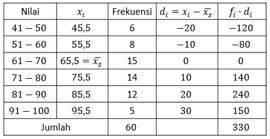 Pertama, kita cari nilai rata-rata dari data di atas dengan metode nilai rata-rata sementara yang tidak ada aturan dalam memilihnya. Dalam soal ini, kita pilih rata-rata sementaranya adalah nilai tengah kelas 61 - 70 yakni 65,5 yang memiliki frekuensi terbanyak. Dengan bantuan tabel berikut, kita bisa menemukan nilai rata-rata yang dimaksud.