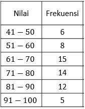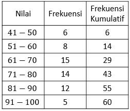 Dari tabel di atas, nilai letak data yang ingin dicari adalah 71 yang berada di kelas 71 - 80 sehingga tepi bawah kelasnya adalah