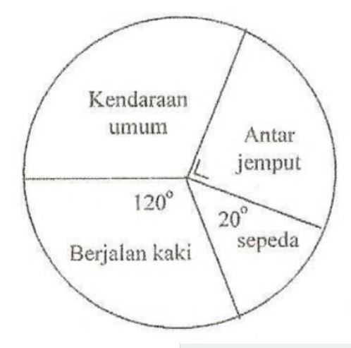 Diagram berikut menggambarkan alat transportasi siswa ke sekolah. Jika banyak siswa yang berjalan kaki 60 orang, banyak siswa yang menggunakan kendaraan umum adalah ...