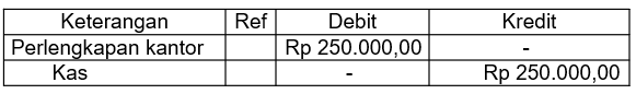 Dibeli secara tunai kertas HVS, tinta printer, dan spidol dari Toko Sejahtera seharga Rp250.000,00. Pencatatan jurnal yang benar adalah ....