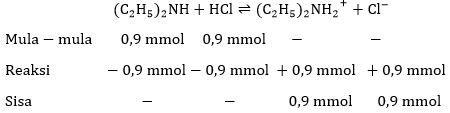 Dietilamina merupakan basa lemah dengan . Suatu larutan dibuat dengan mencampurkan 90 mL larutan dietilamina 0,01 M dan 10 mL larutan HCl 0,09 M. Larutan yang dihasilkan memiliki pH ....