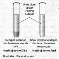 Dika dan Andi melakukan uji urine menggunakan larutan Fehling A dan B. Adapun hasil uji urine yang diperoleh dapat digambarkan seperti berikut.