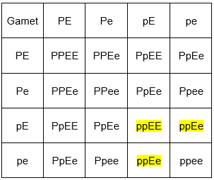 Dikawinkan kucing putih berekor panjang (PPee) dengan kucing hitam berekor pendek (ppEE) menghasilkan F1, semua kucing putih berekor pendek (PpEe). Apabila F1 dikawinkan sesamanya, berapa proporsi kucing yang hitam berekor pendek pada keturunan kedua (F2)?