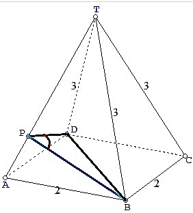 Diketahui limas beraturan T.ABCD dengan rusuk alas 2 cm dan rusuk tegak 3 cm. Jika sudut antara bidang TAD dan bidang TAB adalah maka adalah....