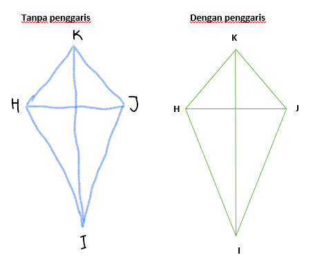 Diketahui panjang masing-masing diagonal layang-layang HIJK adalah 8 cm dan 12 cm. Tanpa menggunakan penggaris, buatlah gambar layang-layang HIJK tersebut. Bandingkan hasilnya dengan layang-layang HIJK yang dibuat dengan penggaris.