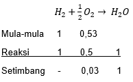 Jika diketahui (Ar H = 1, Ar O = 16) tentukan massa zat yang bersisa dan massa yang terbentuk jika 2 gram bereaksi dengan 17 gram .
