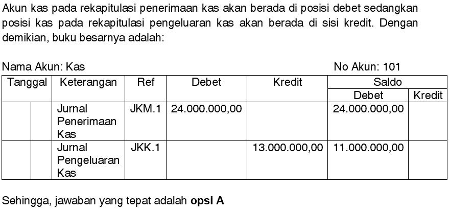 Diketahui saldo Kas pada rekapitulasi jurnal penerimaan kas adalah Rp24.000.000,00. Sedangkan pada rekapitulasi pengeluaran kas Rp13.000.000,00. Saldo kas di buku besar adalah….