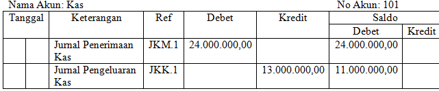 Diketahui saldo Kas pada rekapitulasi jurnal penerimaan kas adalah Rp24.000.000,00. Sedangkan pada rekapitulasi pengeluaran kas Rp13.000.000,00. Saldo kas di buku besar adalah…