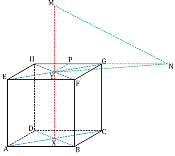 Diketahui sebuah kubus ABCD.EFGH dengan panjang rusuk 4 cm. Titik N berada pada perpanjangan rusuk HG dengan HN : HG = 2 : 1. Titik X dan Y berturut-turut adalah perpotongan diagonal sisi alas dan diagonal sisi atap kubus. Jika titik N berada pada perpanjangan garis XY dengan XY : XM = 1 : 2, maka jarak titik M ke titik N adalah ….
