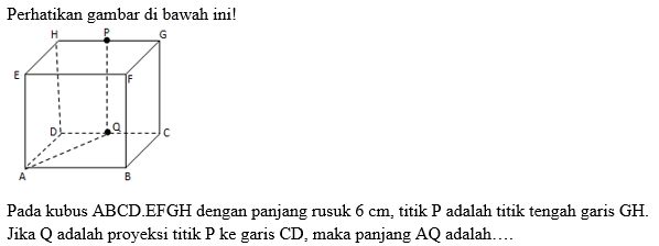 Diketahui sebuah kubus ABCD.EFGH dengan panjang rusuk 8 cm. Jarak titik G ke diagonal sisi BD adalah ….