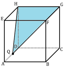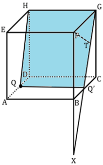 Untuk mempermudah menemukan jarak titik F ke bidang GHQ maka perluas bidang GHQ. Salah satu cara yang dapat digunakan adalah dengan membuat garis sejajar HQ dan melalui G serta buat garis sejajar HG dan melalui Q. Sehingga akan didapatkan gambar seperti berikut