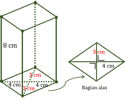 Diketahui sebuah prisma dengan alas belah ketupat. Diagonal belah ketupat 6 cm dan 8 cm. Tinggi prisma 8 cm. Maka luas permukaan prisma adalah .…