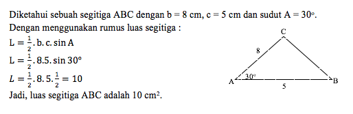 Diketahui sebuah segitiga ABC dengan b = 8 cm, c = 5 cm dan sudut A = 30o. Luas segitiga ABC adalah ....
