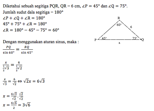 Diketahui sebuah segitiga PQR, QR = 6 cm, dan . Panjang PQ adalah ....