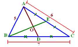 Diketahui segitiga ABC dengan panjang AB = 5 cm, BC = 7 cm, dan AC = 6 cm. Jika garis AD dan BE berpotongan dititik O. Maka panjang AD adalah....